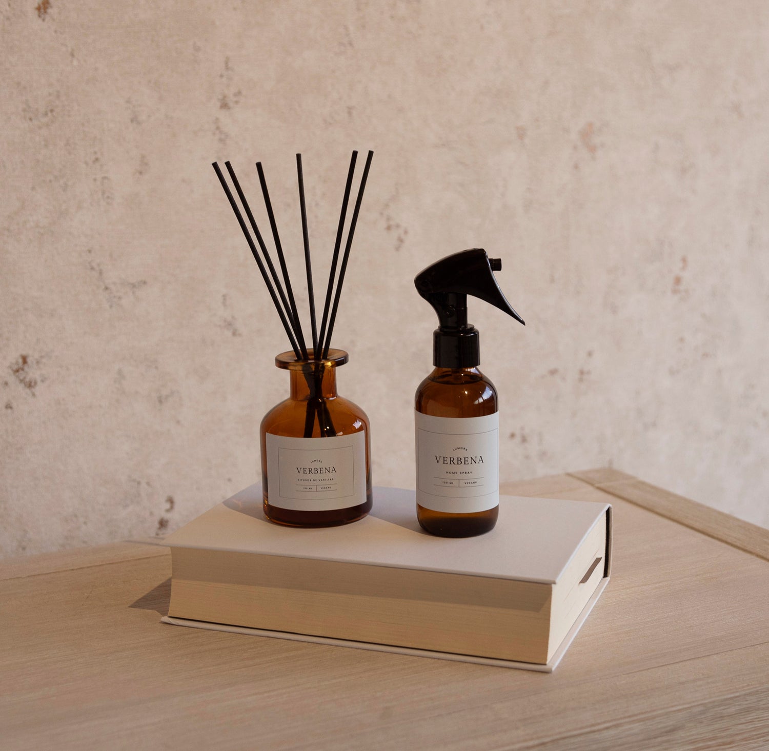 Envase: Vela en frasco de vidrio ámbar con tapa metálica / Difusor en vidrio ámbar con varillas de ratán